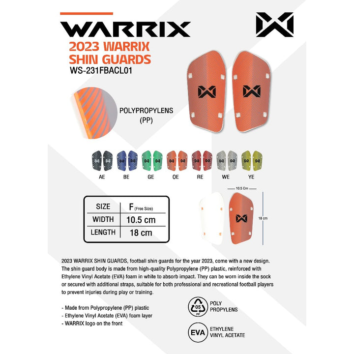 2023 Warrix football shin guards come with new designs. The shin guards are made of high-quality Polypropylens (PP) plastic, lined with white Ethylene Vinyl Acetate (EVA) foam to absorb impact.