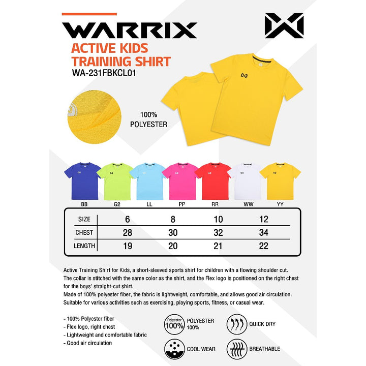 Active Training Shirt for Kids Short-sleeved sports shirt for children with a flowing shoulder cut. The collar is stitched with the same color as the shirt, and the Flex logo Warrix is positioned on the right chest for the boys' straight-cut shirt.