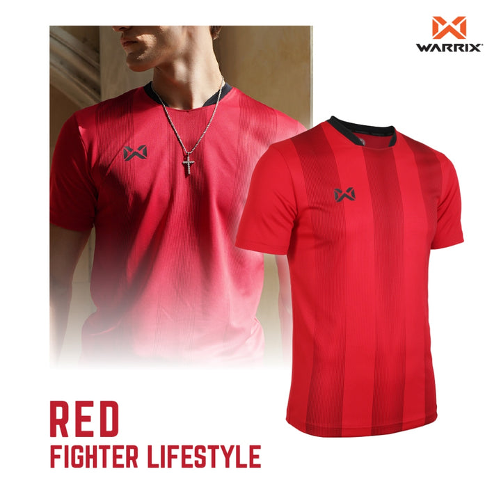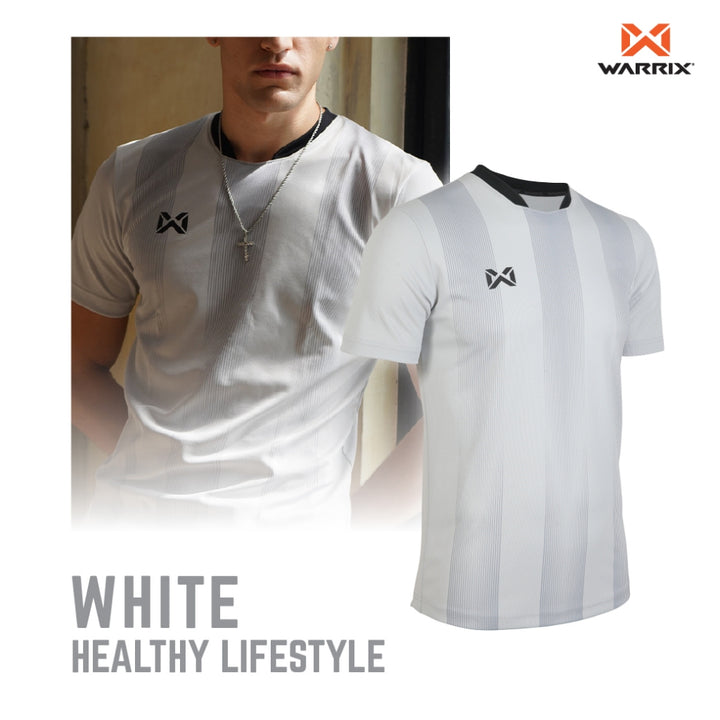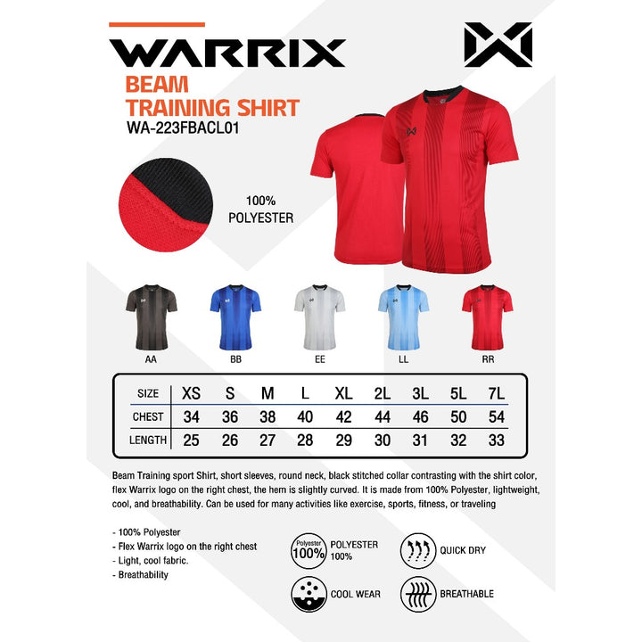 Beam Training sport Shirt, short sleeves, round neck, black stitched collar contrasting with the shirt color, flex Warrix logo on the right chest, the hem is slightly curved. It is made from 100% Polyester, lightweight, cool, and breathability. Can be used for many activities like exercise, sports, fitness, or traveling.
