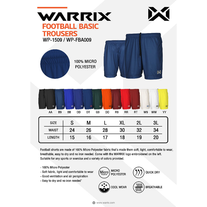 Football Trousers are made of 100% Micro Polyester fabric that’s made them soft, light, comfortable to wear, breathable, easy to dry and no iron needed. Come with the WARRIX logo embroidered on the left. Suitable for any sports or exercise and a variety of colors provided.