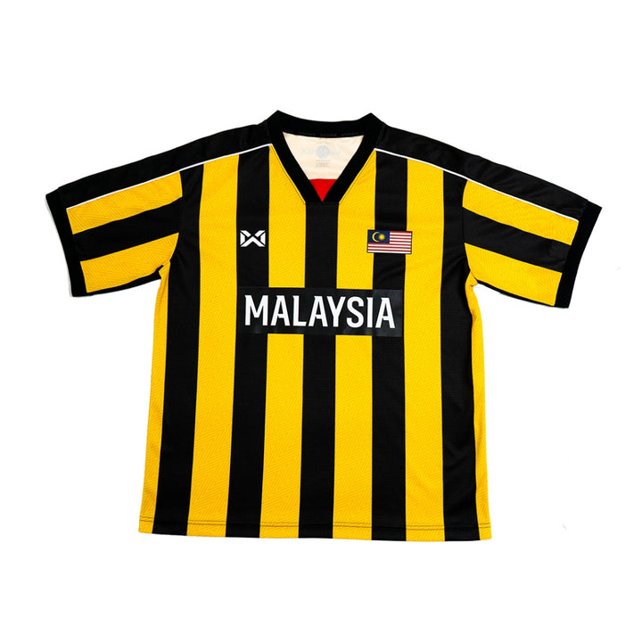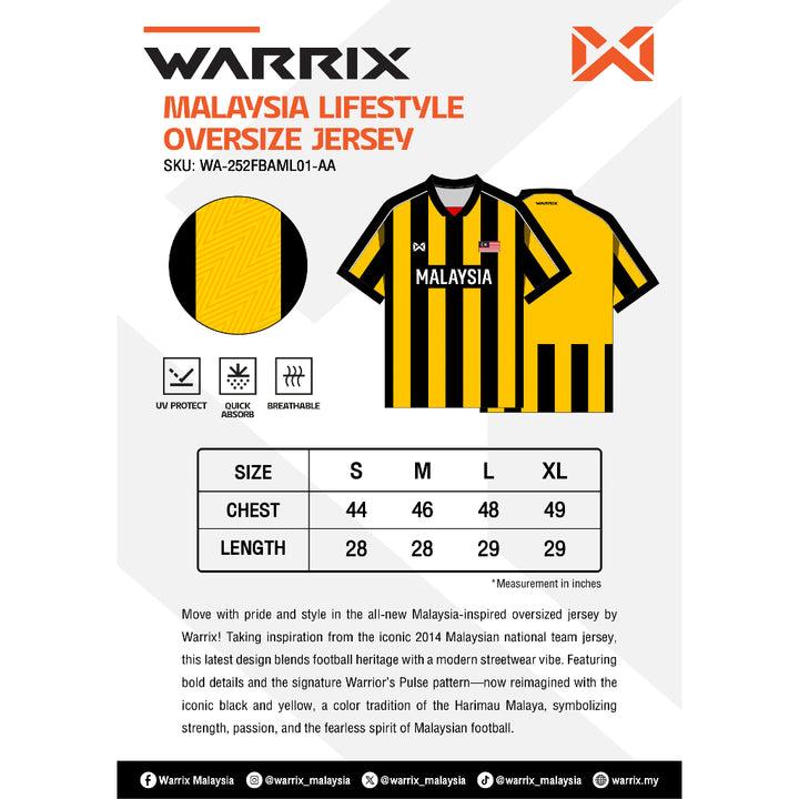 Move with pride and style in the all-new Malaysia-inspired oversized jersey by Warrix! Taking inspiration from the iconic 2014 Malaysian national team jersey, this latest design blends football heritage with a modern streetwear vibe. Featuring bold details and the signature Warrior's Pulse pattern-now reimagined with the iconic black and yellow, a color tradition of the Harimau Malaya, symbolizing strength, passion, and the fearless spirit of Malaysian football.