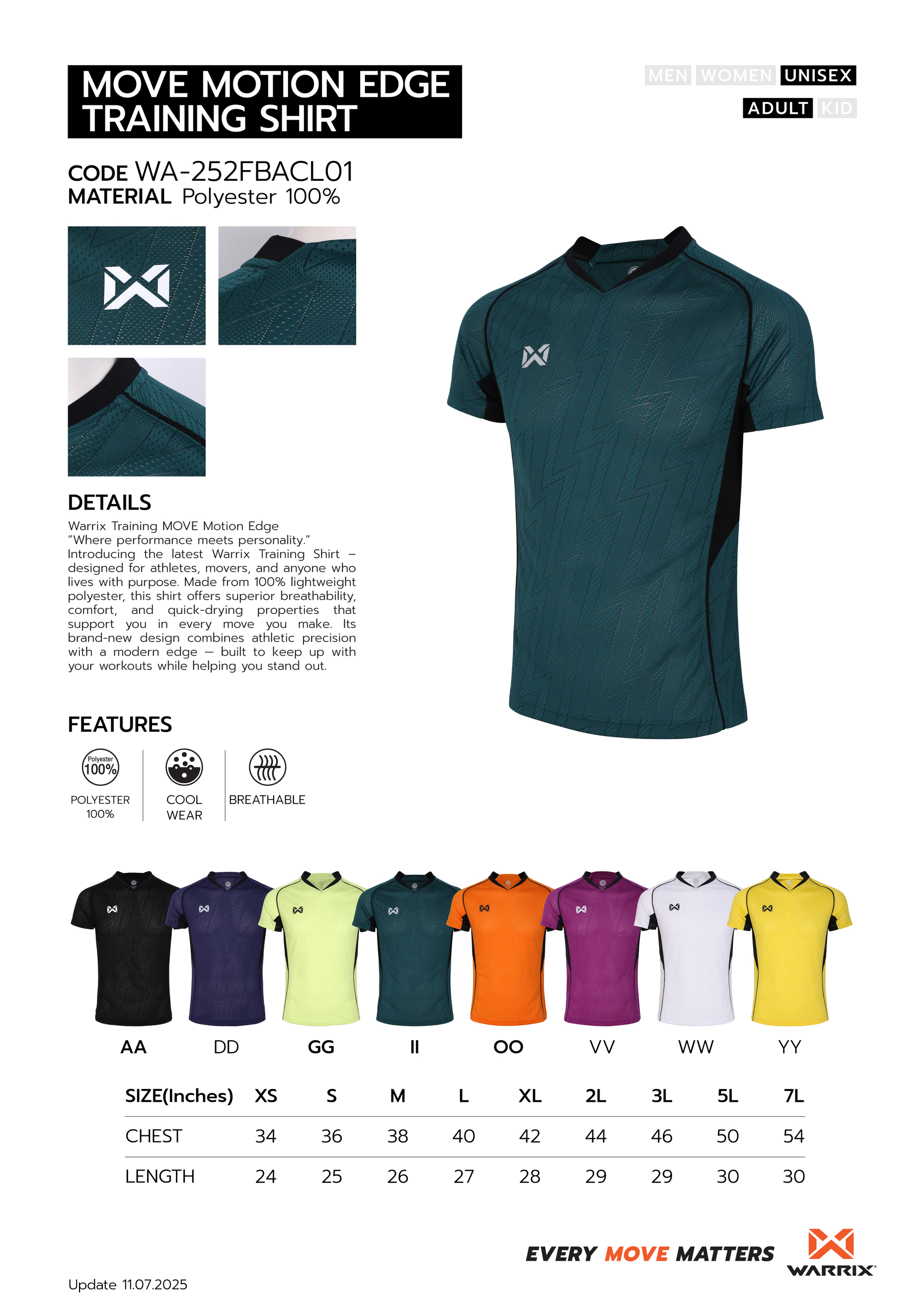 Warrix Training MOVE Motion Edge "Where performance meets personality." Introducing the latest Warrix Training Shirt designed for athletes, movers, and anyone who lives with purpose. Made from 100% lightweight polyester, this shirt offers superior breathability, comfort, and quick-drying properties that support you in every move you make. Its brand-new design combines athletic precision with a modern edge - built to keep up with your workouts while helping you stand out.