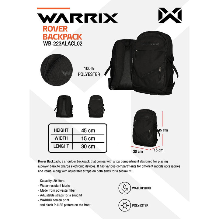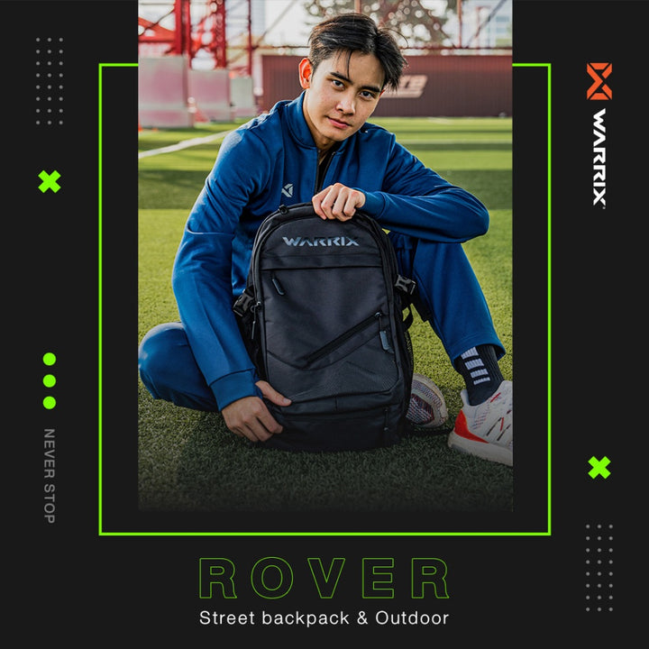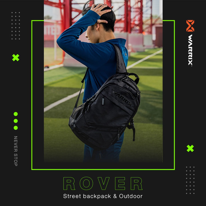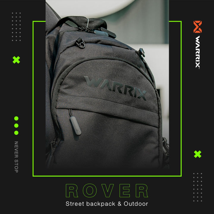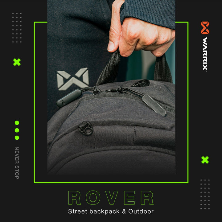 Rover Backpack, a shoulder backpack that comes with top compartment designed for placing a power bank to charge electronic devices. It has various compartments for different mobile accessories and items, along with adjustable straps on both sides for a secure fit.